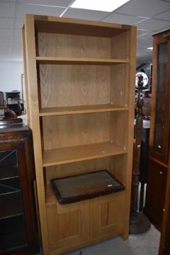 A modern light oak bookcase with three adjustable shelves over two cupboard doors 188cm x 81cm x 32cm