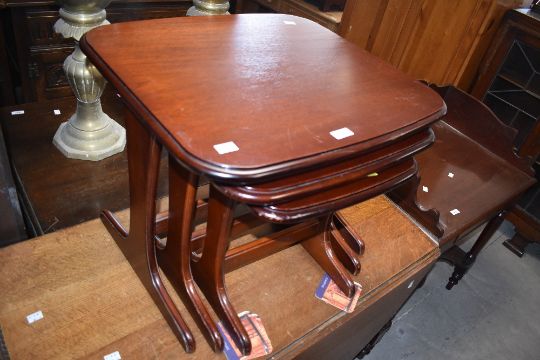 A nest of three stained mahogany tables, of rounded rectangular form, largest 46cm x 57cm x 49cm