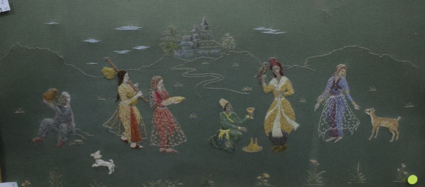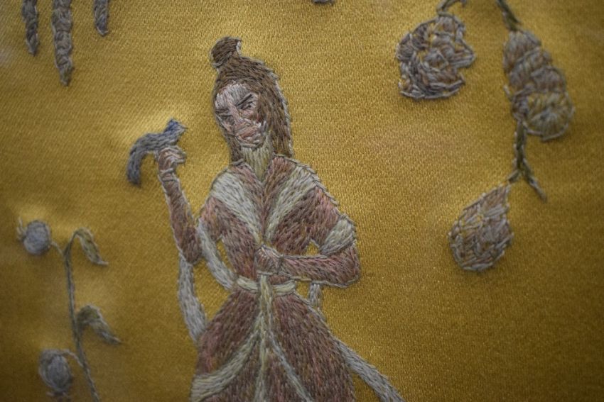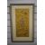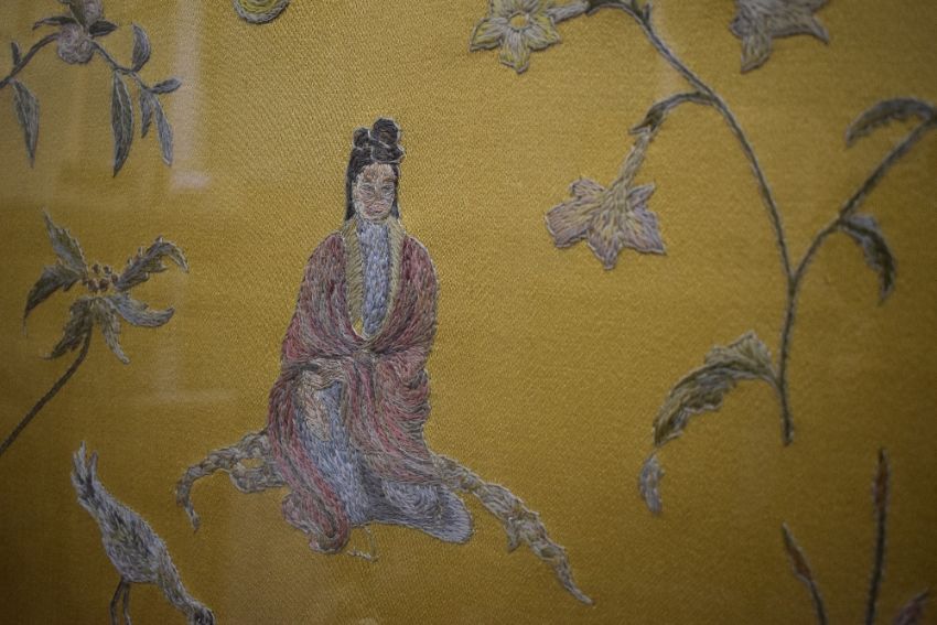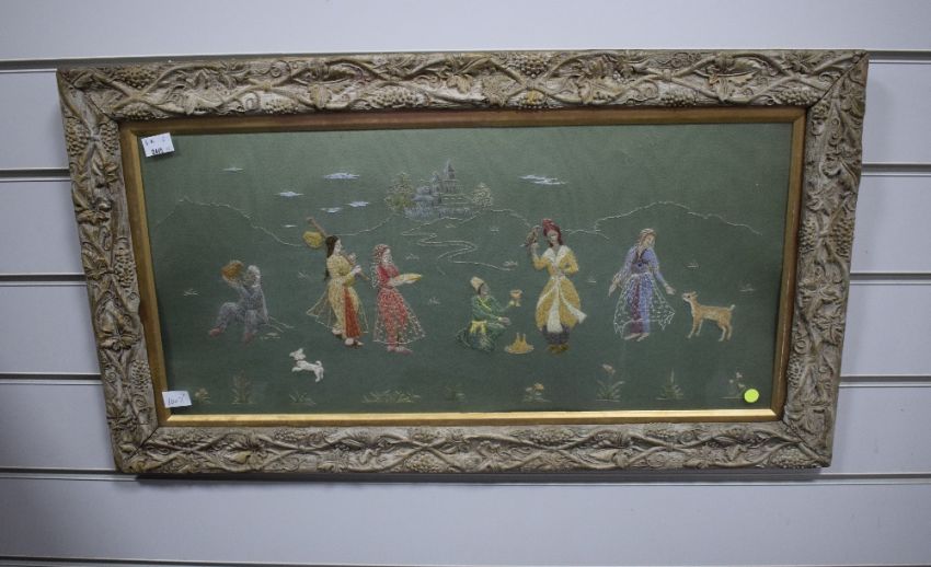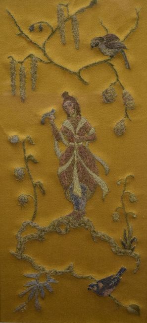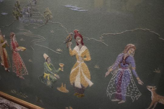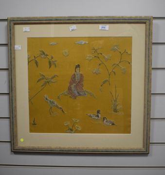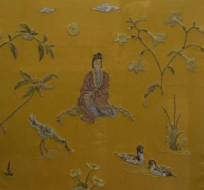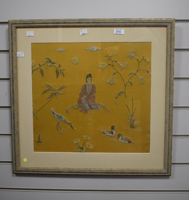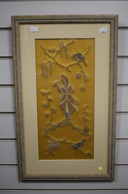 Two decorative Japanese themed embroidered panels, each depicting a central robed female within foliage and birds, all against a gilt/yellow-brown material, within modern card mounts and moulded stained and gilt frames, under glass, largest 38cm x 40.5cm & 54cm x 56cm overall. Sold together with a similar embroidered panel depicting figures within a landscape with central building/temple, against a green material backing, within a gilt slip and fruiting vine moulded frame, under glass 26cm x 57cm & 39cm x 69cm overall.
