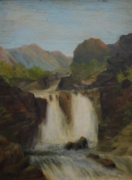 Artist unknown, early 20th century oil on board, waterfall scene, unsigned, within a moulded gilt frame, 60.5cm x 46cm & 74cm x 58cm overall.