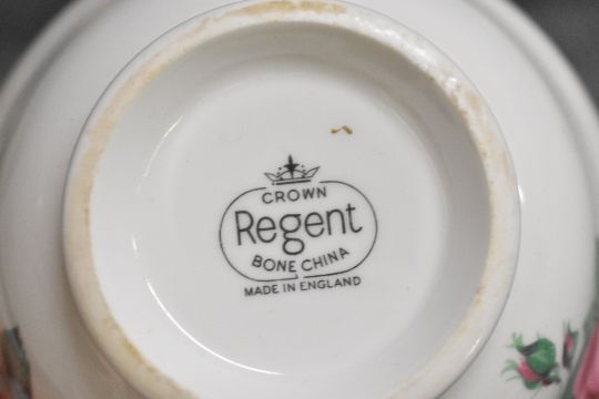 A Rorstand Sweden part dinner service having a grey and white rose motif including large meat serving plate, tureens, plates and dishes etc (27) sold together with a similar Crown Regent part tea service having a pink rose design (17).
