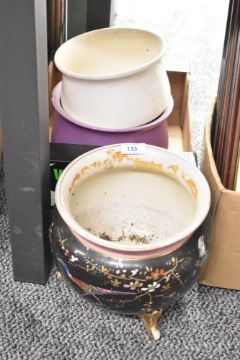 A vintage Shaw & Copestake jardinière having a hand painted picture of a pheasant among undergrowth sold along with two chamber pots.