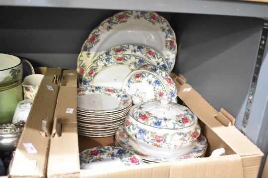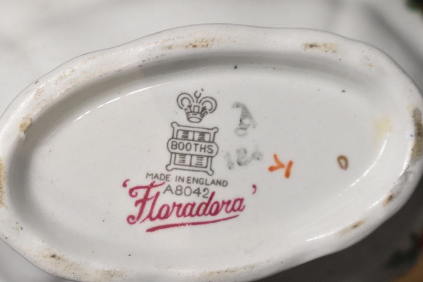 A colourful Booths 'Floradora' part dinner service including oval serving plates, tureens, three sizes of plates and a gravy jug.
