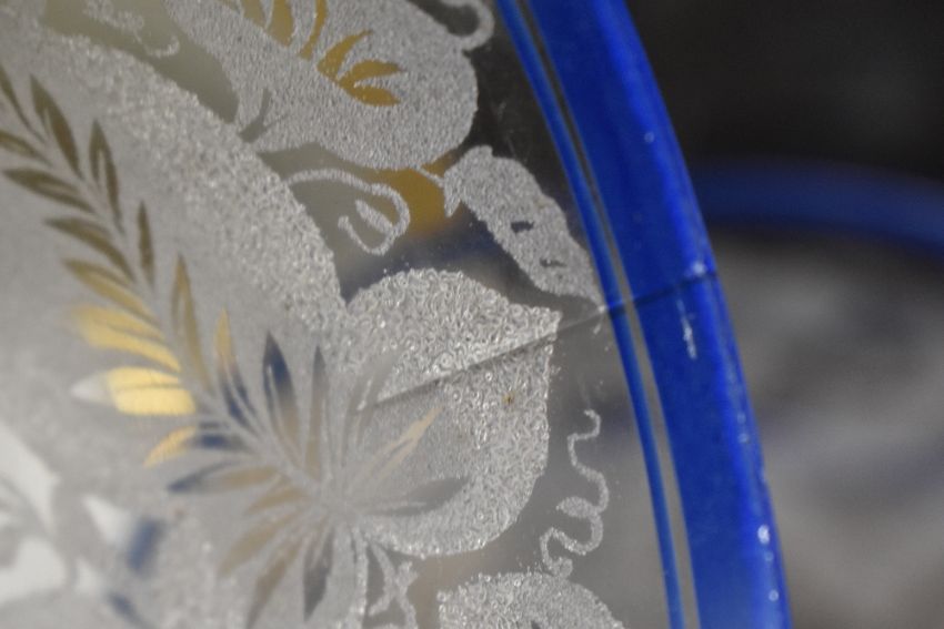 Six blue and white ware plates stamped Bavaria to base, a Royal Bonn Germany tri bowl dish AF, a selection of etched cut glass dishes and side plates etc.