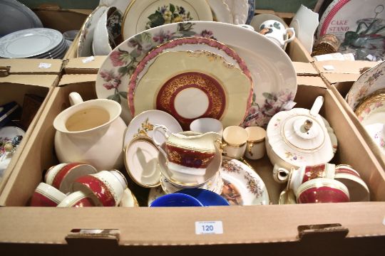 A large oval Laura Ashley plate having cherry blossom design, a Paragon part tea service having burgundy and cream banding with gilt highlights (24), a cream Spode 'Valamore' jug, a Crown Ducal 'Chinese Lanterns' duo etc.