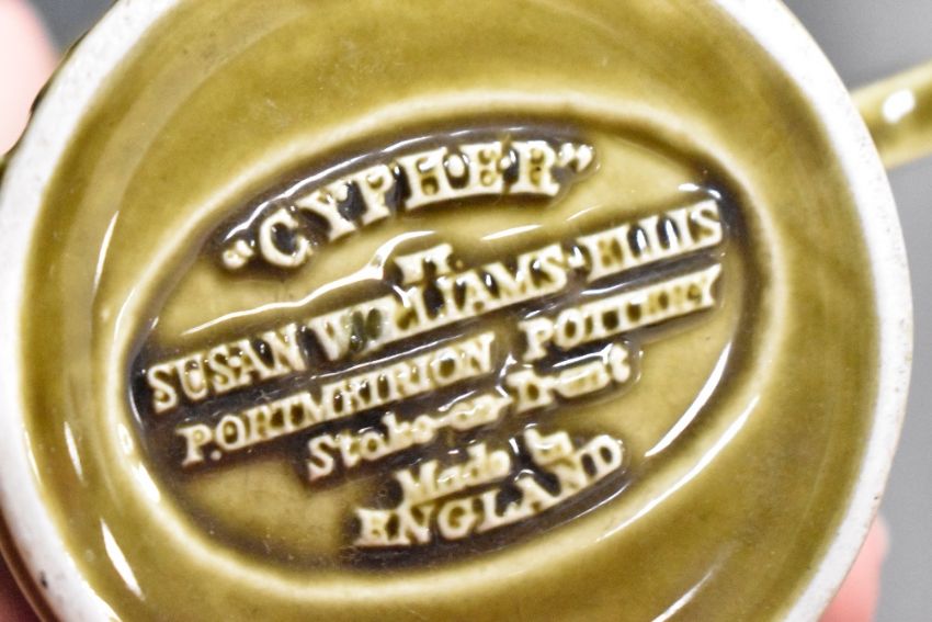 A Susan Williams-Ellis for Portmerion 'Cypher'pattern coffee set in green, comprising coffee pot, six cups and saucers, sugar and cream. Crazing