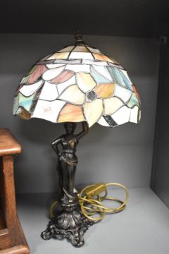 A modern cast metal figural table lamp with leaded Tiffany style glass shade 51cm overall.