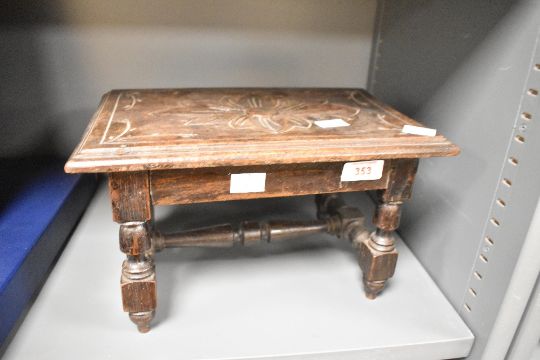 An Edwardian carved oak stool/stand, of rectangular form with stylised foliate carving to the rectangular top, raised on turned supports with stretcher 30cm wide