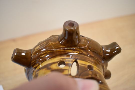 A 19th Century slipware puzzle jug, height approx 21cm, sold with two traditional cow creamers and a studio pottery cup