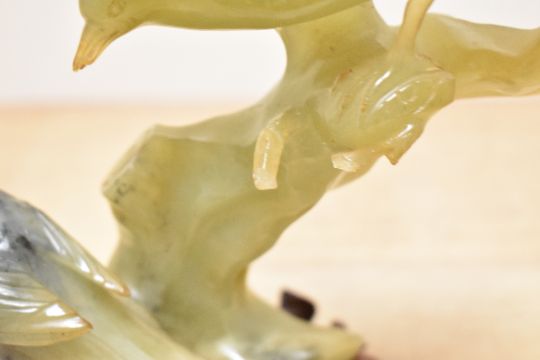 A Chinese style jade/ hard stone bird sculpture raised on a wooden base, h21.5