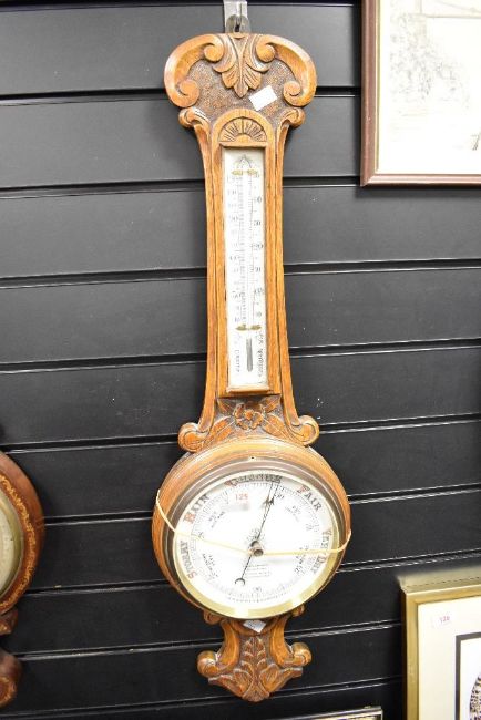 A early 20th century oak barometer having temperature gauge, h85cm