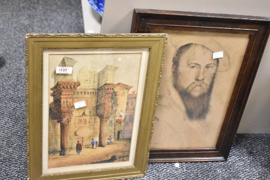 (British School) 19th century print of a Roman architectural facade, 32cm x 42cm, sold together with a print of a Knight, (2)