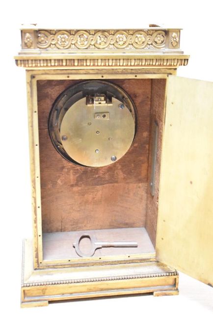 A fine late 19th / early 20th century mantel clock having drum movement with platform escapement, decorated with gilt case and shagreen panels, h31cm