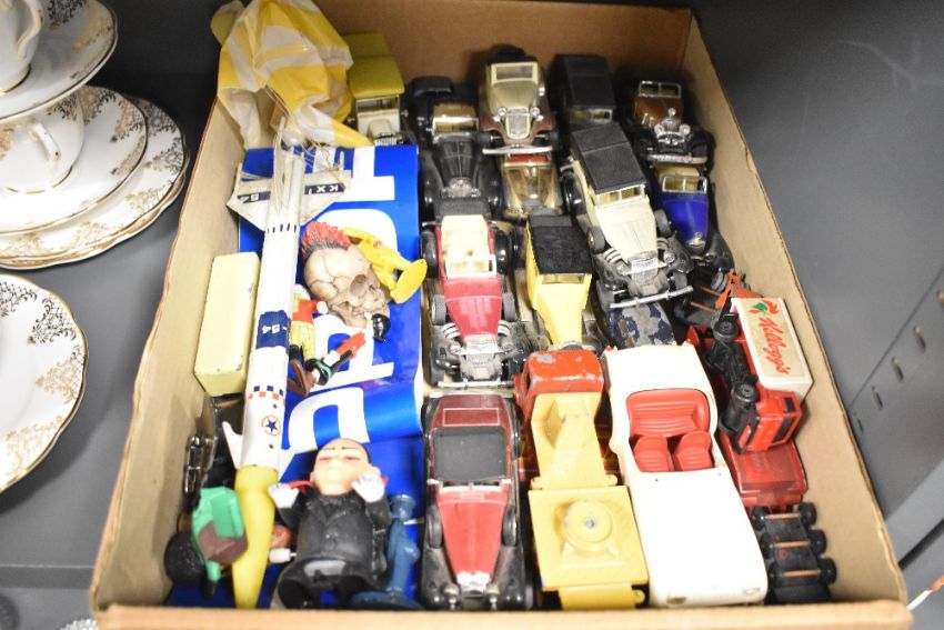 Playworn Die-casts, Matchbox Models of Yesteryear, Corgi and similar along with a plastic Agrespoly (hong kong) Triumph Car, 1977 Matchbox Catalogue etc