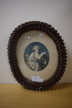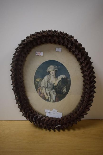 A late 19th/early 20th century 'Tramp Art' oval picture frame, intricately constructed out of small blocks of wood of conforming design, 52cm x 41cm overall.
