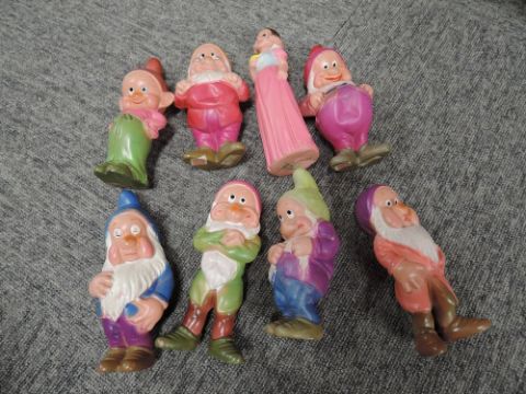 Japanese celluloid Walt Disney Snow White and the Seven Dwarfs, with ‘By Permission of Walt Disney Mickey Mouse Ltd’, height of Snow White 16.5cm, some squashed and a few other slight dents (8)
