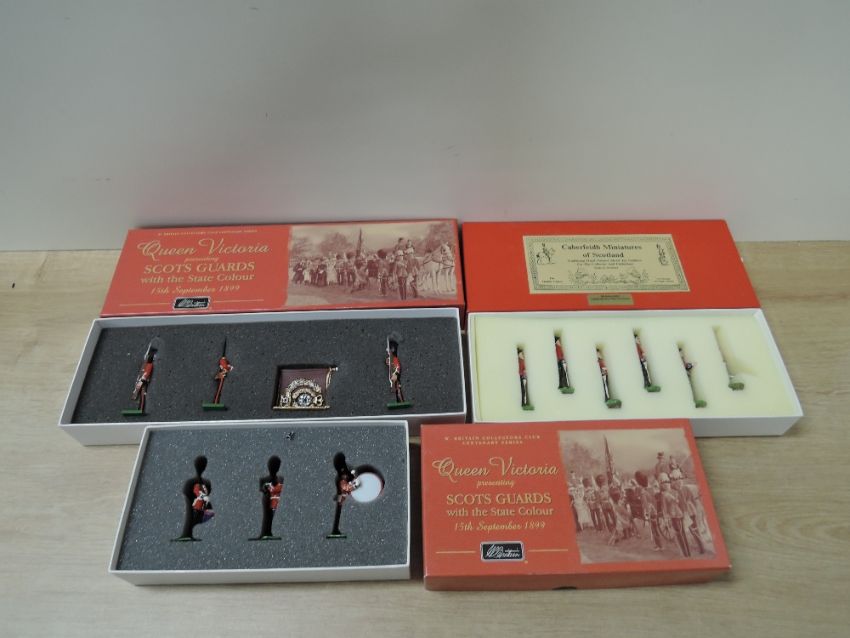 Britains & Caberfeidh Miniatures, W Britains Lead Soldier Sets, Collectors Club Centenary Series 5991 Scots Guards Colour Party with State Colour, 5992 Scots Guards Band Set, Caberfeidh Miniatures The Royal Scots, all boxed with internal packaging present, very little use (3)
