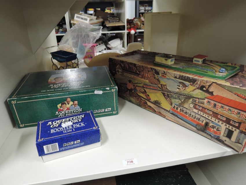 Techofix Tin Plate No 300 Alpine Part Set in original box, mising bus and key, similar small tin plate set and a Question of Sport Game with Booster Pack Team 1 by BBC TV, both appear complete, boxes tired (4)