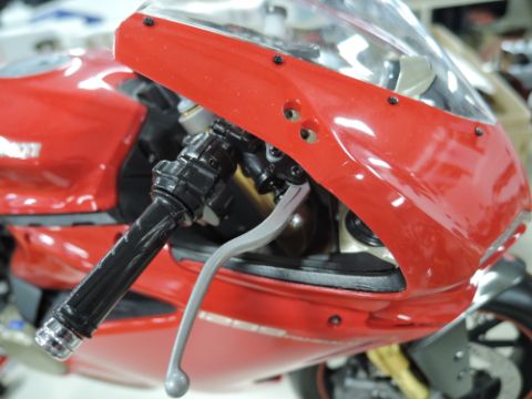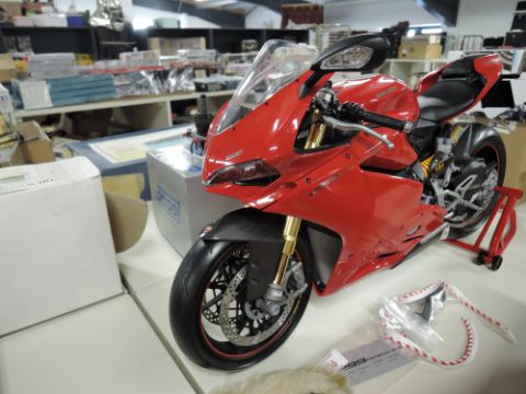 Pocher 1:4 scale made up model kit, Ducati 1299 Panigale S, one wing mirror attached and one loose, name plate present on rear wheel stand