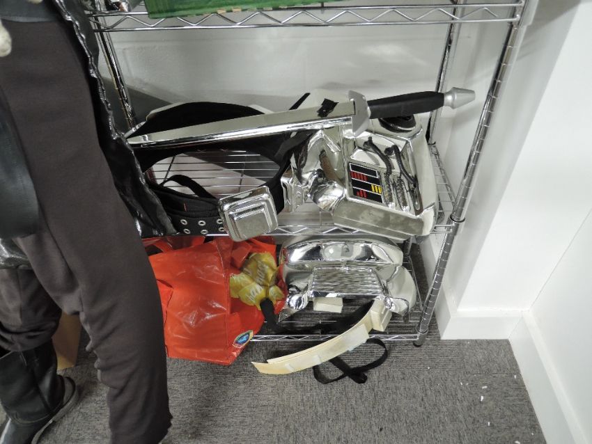 Battlestar Galactica, Full Size Silver Cylon Centurion Costume of plastic and cloth constructions with most panels present, with Helmet and boats along with sword and other accessories, on a full size manikin, height approx 180cm