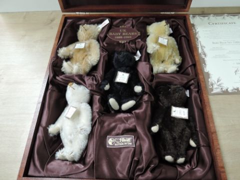 Steiff Bears, Modern Mohair Limited Edition Bears, 654695 UK Baby Bear Set 1999, 1989-1993 Five Bears, 00876/1847 certificate present, heights 16cm each, all with white tags, wooden folding display box with external card box present