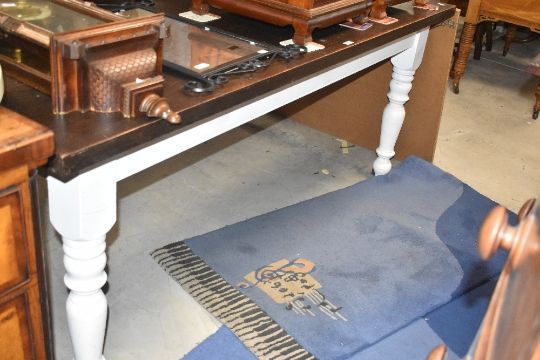 A stained and painted pine farmhouse style kitchen table, of rectangular form with turned legs 78cm x 183cm x 107cm