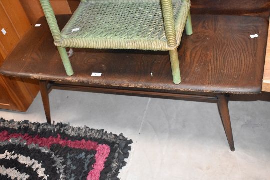 An Ercol dark elm coffee table, of oblong form with spindle under-tier 36cm x 103cm x 41cm