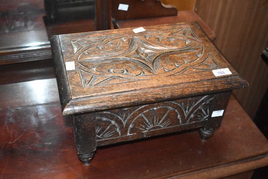 A carved oak lidded storage box of small proportions, width approx. 36cm
