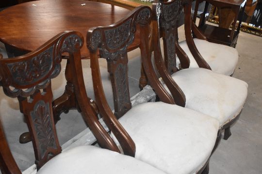 A set if late Victorian salon style dining chairs having overstuffed seats , in need of upholstery