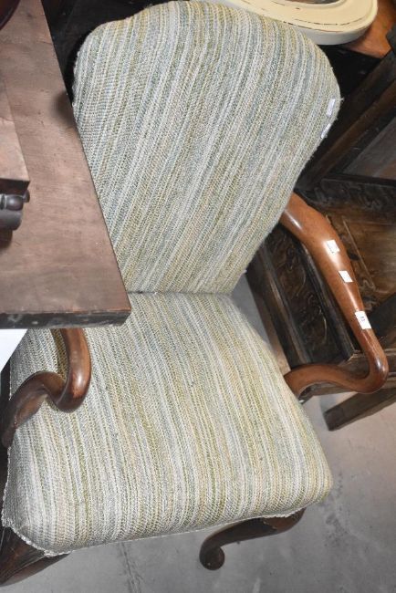 A mahogany Queen Anne style armchair, with arched back shaped arms and carved cabriole type legs, the seat and back upholstered with striped material seat height 45cm