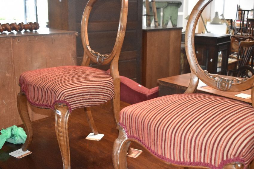 A pair of Victorian salon chairs having later stripe upholstery
