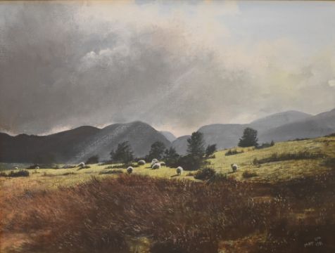 Local interest* Meg Lee (British 20th century) oil on canvas, local pastoral scene with sheep, signed and dated 1981 lower right, within a moulded gilt frame, 29.5cm x 40cm & 36cm x 46cm overall.