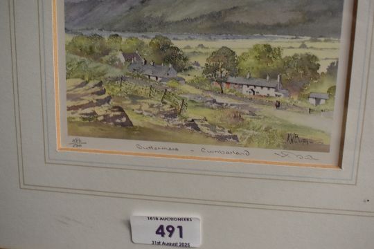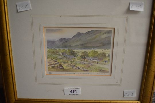 *Local Interest* After Kenneth W. Burton (1946) limited edition colour print 'Buttermere - Cumberland' a landscape looking over cottages in Buttermere village with lake and High Stile fell range in the background, numbered 484/600 titled and signed, within washline mount and gilt frame, under glass 13.5cm x 10cm & 33cm x 28cm overall, being sold for charity.