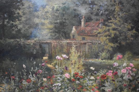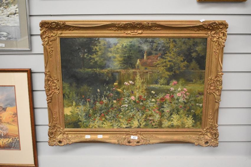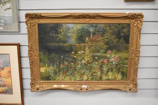 Artist unknown, a 20th century oil on canvas, country garden scene with blossoming flowers, house and gated wall beyond, unsigned, within a moulded gilt frame 49cm x 75cm & 66cm x 92cm overall.