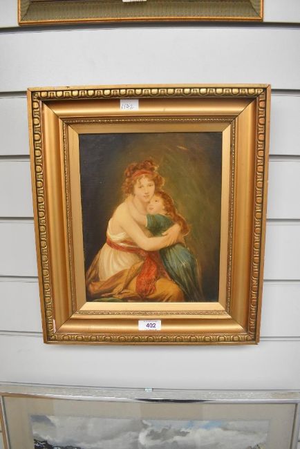 Artist unknown, after Louise-Elisabeth Vigee-Le Brun (French 1755-1842) oil on canvas 'Self portrait with her daughter Julie' unsigned, within a moulded gilt frame, 26cm x 21cm & 39cm x 34cm overall. Two small abrasions, rear of canvas covered with backing board.
