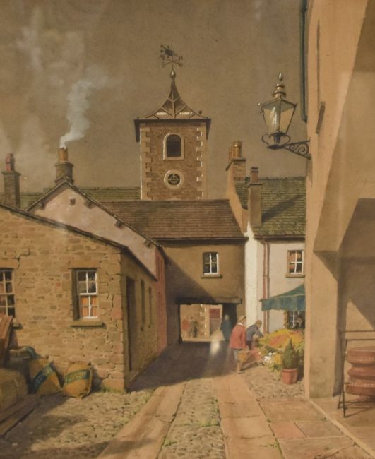 *Local Interest* Geoffrey H. Pooley (British 1908-2006) Watercolour, the Moot Hall Keswick depicted from Lake Road Court behind the Oddfellow Arms, signed and dated (1981) lower right, within a stepped card mount and moulded gilt frame, under glass 36.5cm x 30cm & 56.5cm x 49cm overall