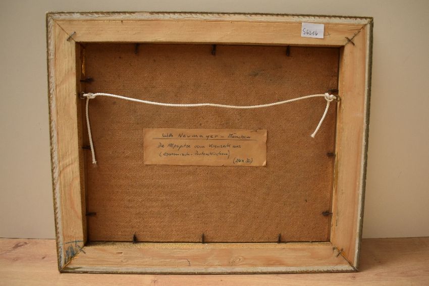 Wilhelm (Willy) Neumayer (German 1912-1991) oil on board 'Alpspitze from Kreuzeck' indistinctly signed lower right, entitled with artists details in German to hand-written paper label verso, within a moulded gilt frame, 22.5cm x 29cm & 31cm x 37cm overall.