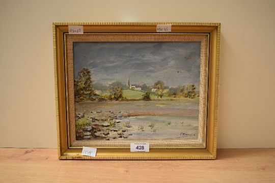 Local interest* Fred McJannet (British 20th century) oil on board, local coastal scene with church and buildings, signed lower right, within a canvas mounted and moulded gilt frame 18.5cm x 23cm & 25cm x 29.5cm overall.
