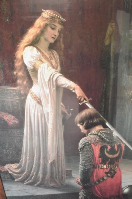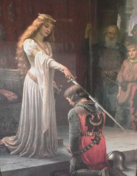 After Edmund Blair Leighton (British 1853-1922) decorative colour print 'The Accolade' within a modern stained wooden effect frame, under glass/perspex, 86cm x 61cm & 92cm x 67cm overall.