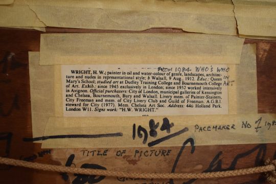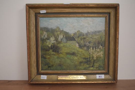 Herbert William Wright (British 1912-1989) oil on panel 'Green Spring' signed lower left, within a moulded frame with attached gilt presentation tablet 'Presented to The Cardiac Surgical Team by H.W Wright' entitled in ink verso along with inscription from the artist and applied excerpt from 1984 Who's Who.