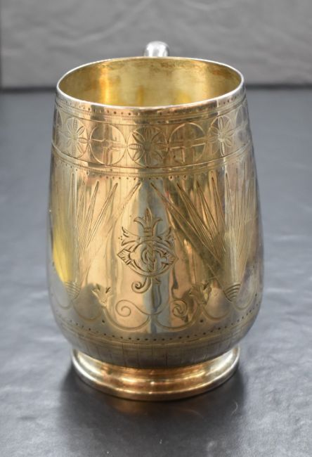 A Victorian silver tankard, of slightly bulbous form having decorative engraving and central monogram to the body with a C-curve handle, raised on a circular moulded foot, marks for London 1873, maker Elkington & Co (Frederick Elkington), 12.5cm, 272g