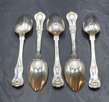 A group of three early 19th century silver King's pattern spoons, two having monograms to the terminals, marks for London 1827, 1829, rubbed makers marks and one with all mark rubbed, along with a pair of William IV silver Queen's pattern spoons, one having a heraldic crest, marks for London 1833, rubbed makers marks, 300g gross