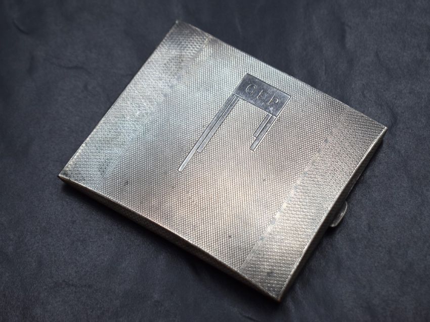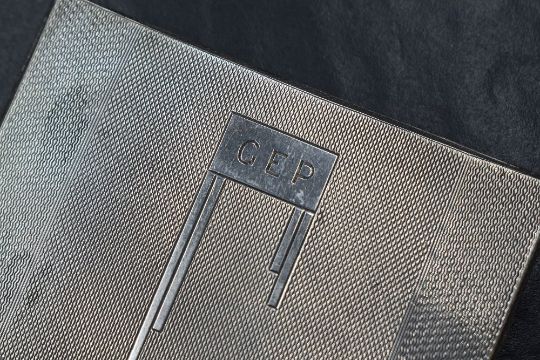 A George V silver cigarette case, of hinged rectangular form having engine turned decoration and central rectangular cartouche engraved 'G.E.P', marks for Birmingham 1933, maker W T Toghill & Co, 8.5cm x 9.5cm, 113g