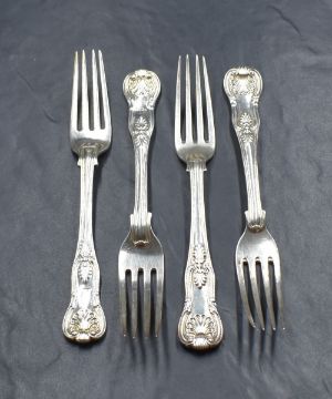 Two pairs of George IV silver King's pattern forks, having bird and griffin heraldic crests to the terminals, marks for London 1824, 1826, makers William Chawner II and William Eley (II), Charles Eley & Henry Eley, 231g gross
