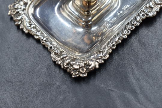 A George IV silver chamberstick, of traditional form having a rectangular sconce with a floral scroll rim, raised on a knopped stem with candle snuffer, on a rectangular base also with a floral scroll rim with a decorative scroll handle, marks for London 1829, maker Thomas Blagden & Co, 9.5cm x 8cm, 112g