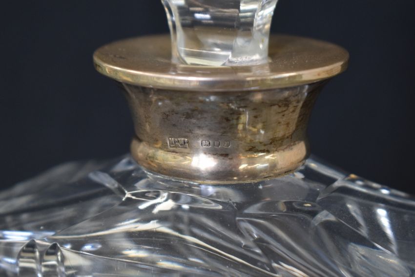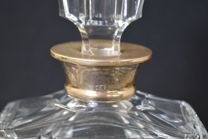 An Elizabeth II silver mounted glass decanter, of rectangular form having a flared silver rim to the decorative moulded body, marks for London 1972, maker Mappin & Webb Ltd, 25.5cm