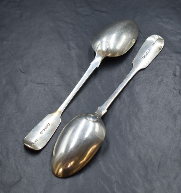 A pair of Victorian silver fiddle pattern serving spoons, having 'D' initial to terminals, marks for London 1870, maker Chawner & Co, 159g