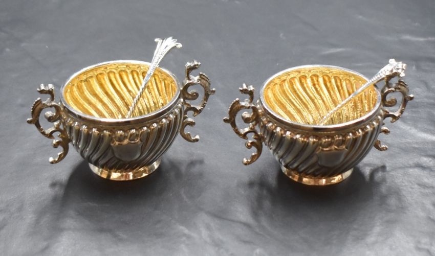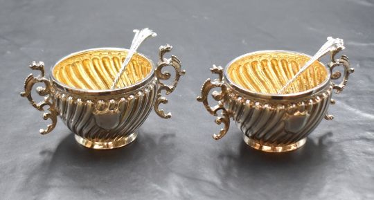 A pair of Victorian silver salts, of traditional form having gadrooned bodies with vacant shield cartouches and decorative scroll handles, raised on circular feet, with two Onslow style pattern spoons, marks for London 1881, maker Henry John Lias & James Wakely, 147g
