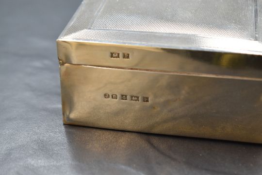 An Elizabeth II silver cigarette box, of hinged rectangular form having engine turned decoration and a vacant rectangular cartouche, with wooden lined interior, marks for Birmingham 1970, maker John Rose, 11.5cm x 8.5cm x 4cm, 326g