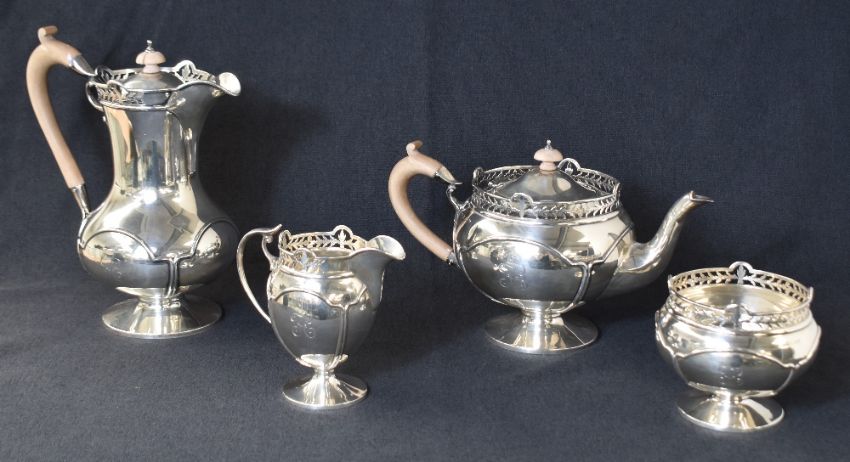 An early George V silver four piece tea set, comprising a coffee pot, teapot, sugar and cream, of bulbous form having decorative pierced and moulded rims with further moulding to the bodies and 'H' initial engraved, raised on circular feet, marks for Birmingham, Sheffield 1913, 1914, maker E S Barnsley & Co, 1932g gross